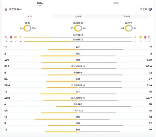 诺丁汉森林vs切尔西全场主要数据对比: