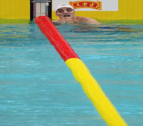 获得50米蛙泳冠军的一刻,尚在泳池中的郑英昊看上去有些迟疑,他似乎有些不相信是自己拿到了金牌,也不相信自己这一次创造了26秒97的个人最好成绩。