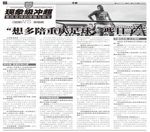 这一年我经常跟年轻球员说,一名职业球员如果不去顶级联赛看一下,甚至如果连冲进顶级联赛的信心和勇气都没有,那么从事这个职业没有任何意义。我们队也有一些中生代球员,向余望也已经23了,我希望他们保持着对更高平台的向往,这样才有足够的勇气去克服困难。我觉得用这种方式激励他们比较有用。当然,他们也很争气,证明了重庆足球的坚韧。